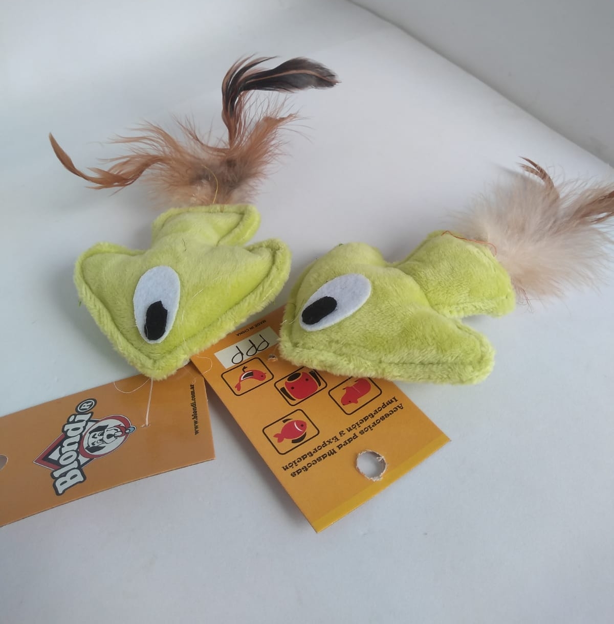 Pez peluche con pluma.