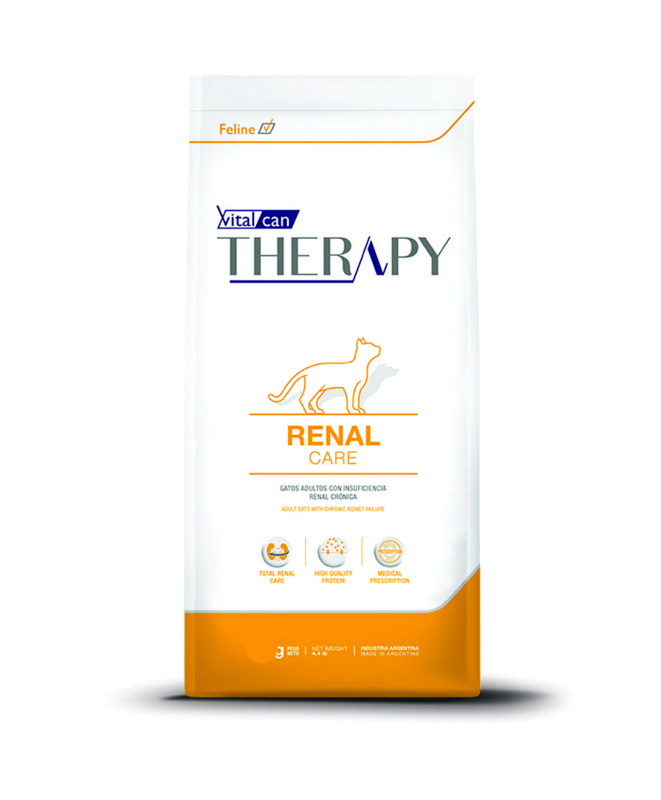 Vitalcan Therapy Renal Care es un alimento de prescripción médica para gatos adultos con enfermedad renal crónica (ERC). Su bajo contenido de fósforo potencia el funcionamiento del riñón. Aporta proteínas de alto valor biológico y digestibilidad que minimizan su catabolismo. Su combinación de ingredientes previene también patologías asociadas, tales como la hipertensión.